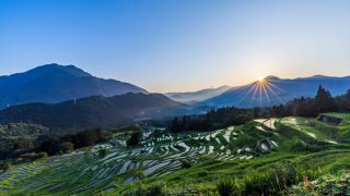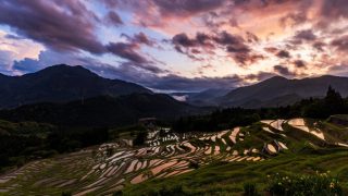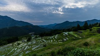 ほんの一瞬の雲の隙間から、精一杯の力で棚田の水面を色付けてくれます。 大いなる自然のサービスに感謝のショットです。