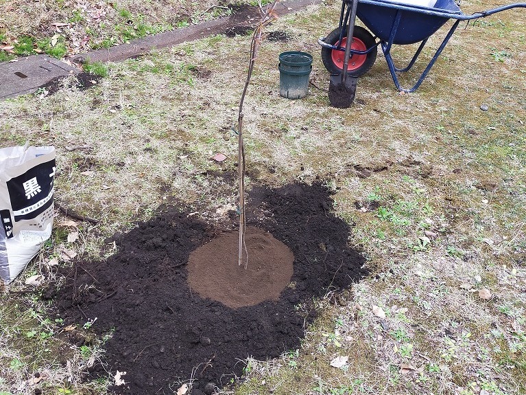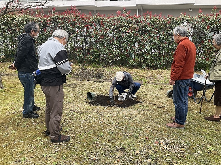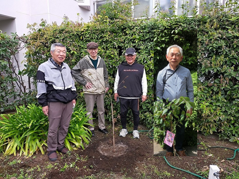 2年前に一度実施されたのですが残念ながら根付かず、再挑戦が企画されたものの、大規模修繕工事のためほぼ1年先送りとなり、今回二度目の挑戦となりました。この植樹がもし成功すれば、ハイムに既にある、ソメイヨシノ、カンヒザクラ、ヨウコウザクラ、シダレザクラ、ベニシダレ、ヤマザクラにつづいて7種目の新しい桜となります。