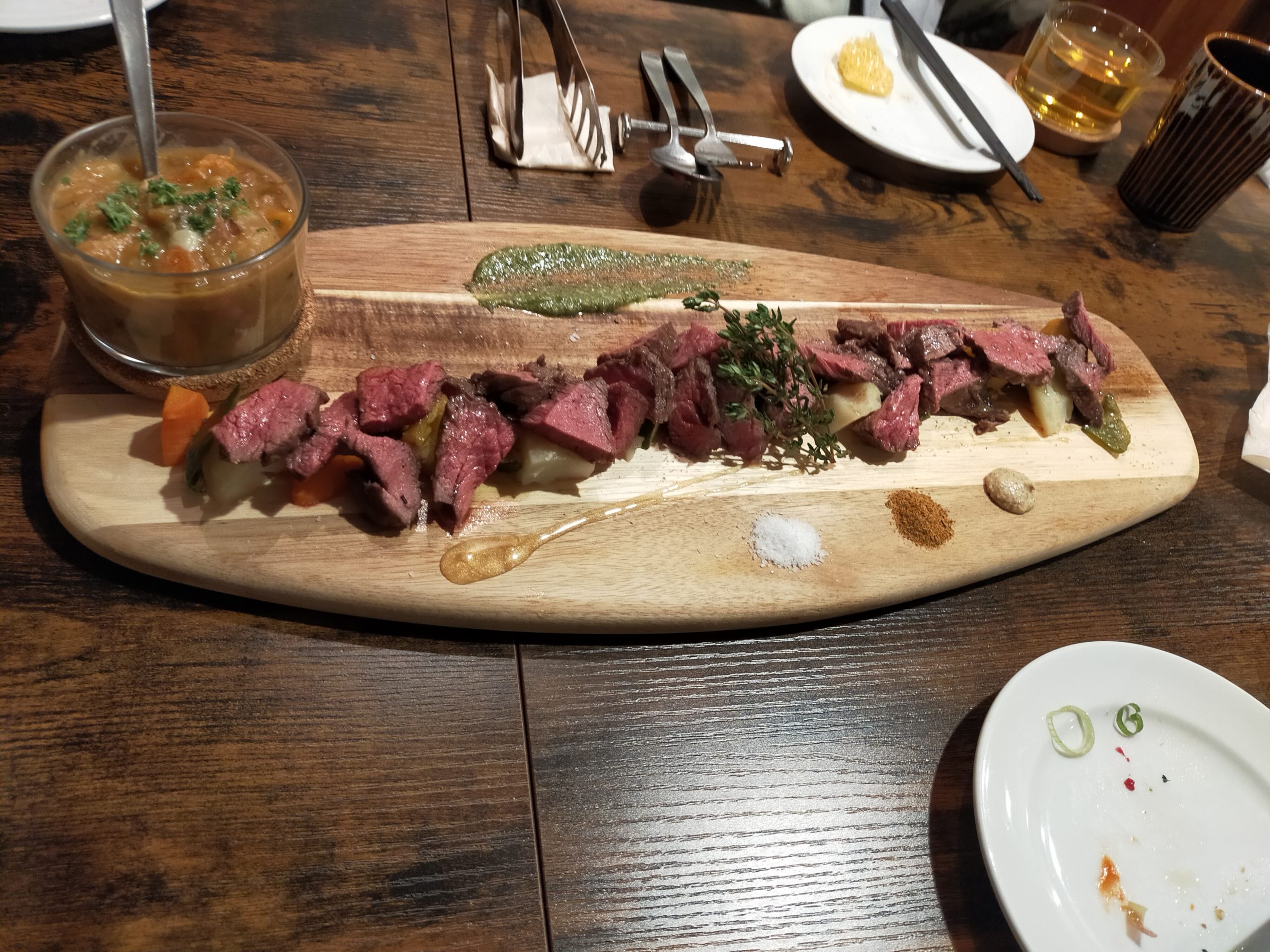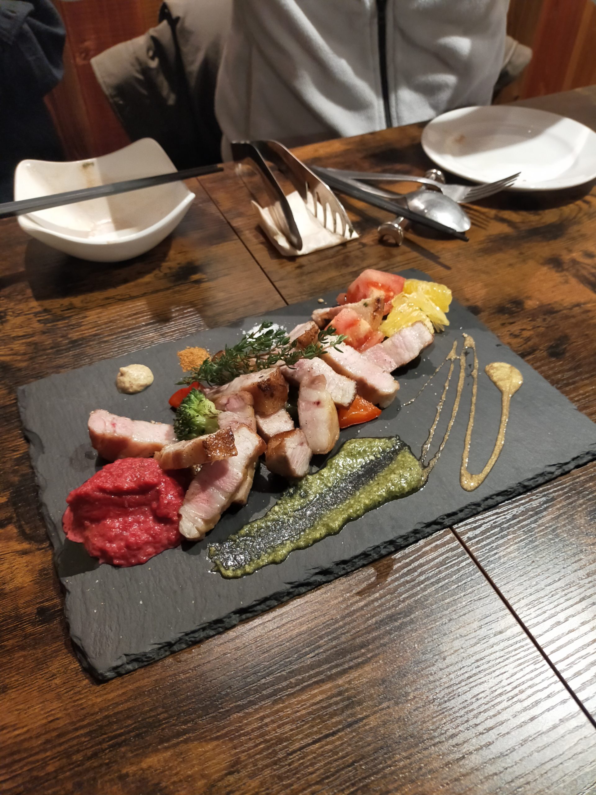 何を食べようか迷ったが、肉の店ならまず代表的な肉だろうと、男二人は「牛肉グリル」(1)を、女性二人はイベリコ豚のベーコン(2)をメインにして、サラダ(3)やピッツアを注文。田舎では少し高いと感じる人もいるだろうが、すべて手の込んだ調理がされており味に納得。近くにあったら通いたい店だ。
