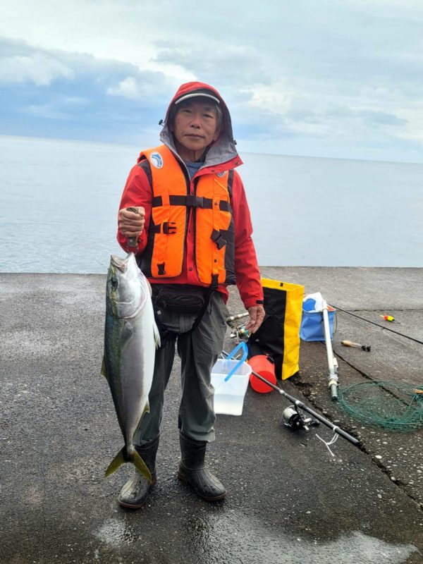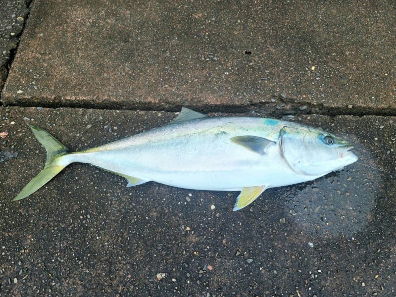 19日朝、近くの防潮堤へ釣りに行ったところ、8体長5cmの丸々太った寒ブリが釣れました。