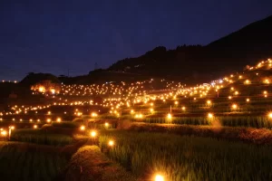 害虫駆除と豊作を願って、棚田の枚数と同じ1340本のキャンドルがともされると、美しい棚田の形が暗闇の中に浮かび上がりました。