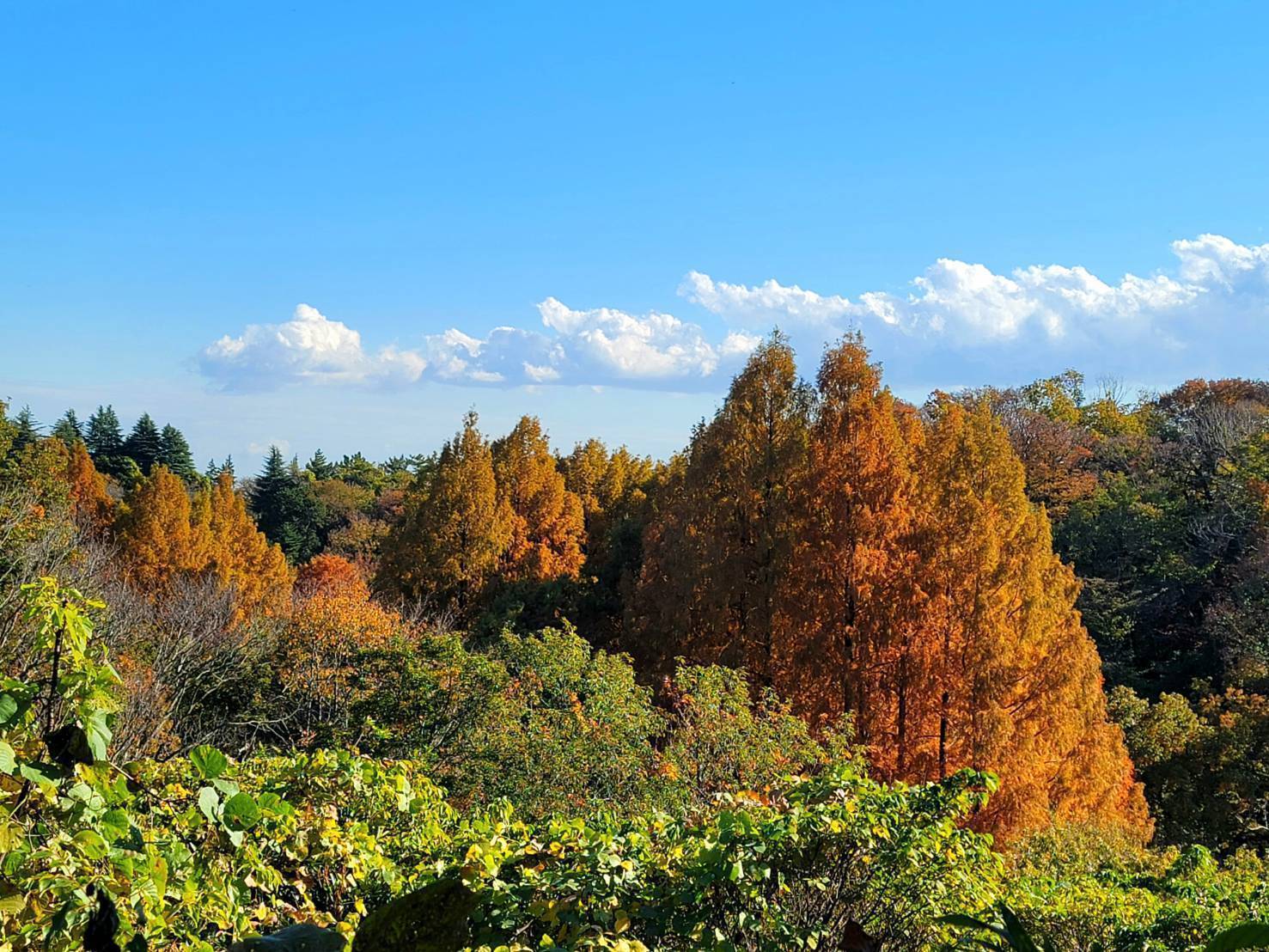 一番上は、伝統工芸館から下に下る途中の展望台から見たメタセコイヤ。2枚目は、岡本太郎美術館の庭から見たもの。3枚目は、メタセコイヤの樹林の下から見上げた景色です。